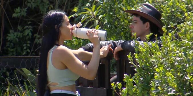 Responsável pela horta nesta semana, Tàmires Assîs estava realizando o trato quando foi até a porteira se hidratar com a garrafa de água levada por Dudu Camargo. Quando a peoa deu o primeiro gole, o sinal tocou e não teve volta.