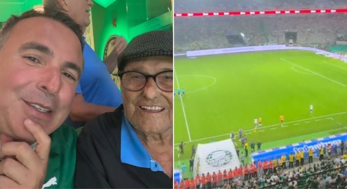 Encontro emocionante de palmeirenses! O apresentador do Cidade Alerta, Reinaldo Gottino, viveu um momento especial ao conhecer uma verdadeira figura durante a partida do Palmeiras no Allianz Parque: o senhor Wilson Picaro, de 95 anos.