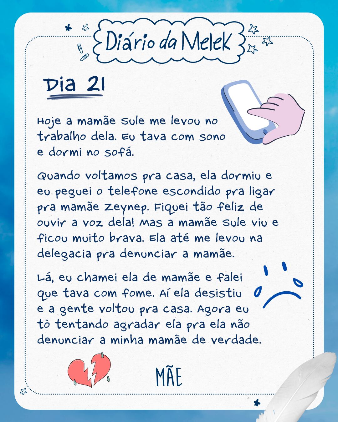 Quando voltamos pra casa, ela dormiu e eu peguei o telefone escondido pra ligar pra mamãe Zeynep. Fiquei tão feliz de ouvir a voz dela! Mas a mamãe Sule viu e ficou muito brava. Ela até me levou na delegacia pra denunciar a mamãe.