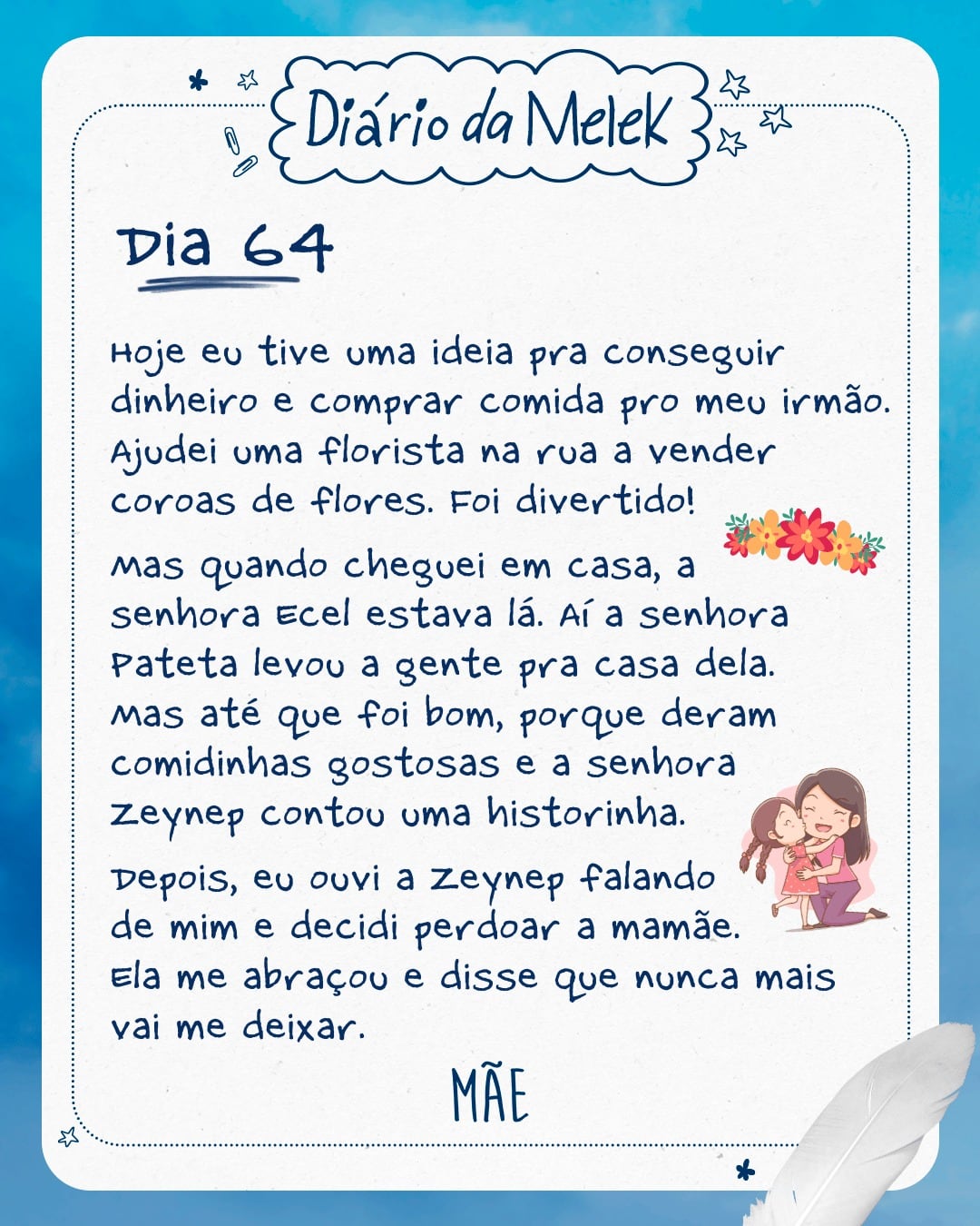 Hoje eu tive uma ideia pra conseguir dinheiro e comprar comida pro meu irmão. Ajudei uma florista na rua a vender coroas de flores. Foi divertido!