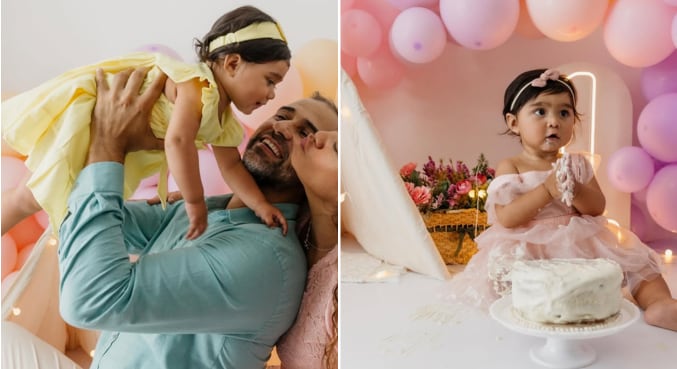 A publicação feita pela esposa em colaboração com o ator mostra a pequena brincando com seu bolo de aniversário e sorrindo com os pais.