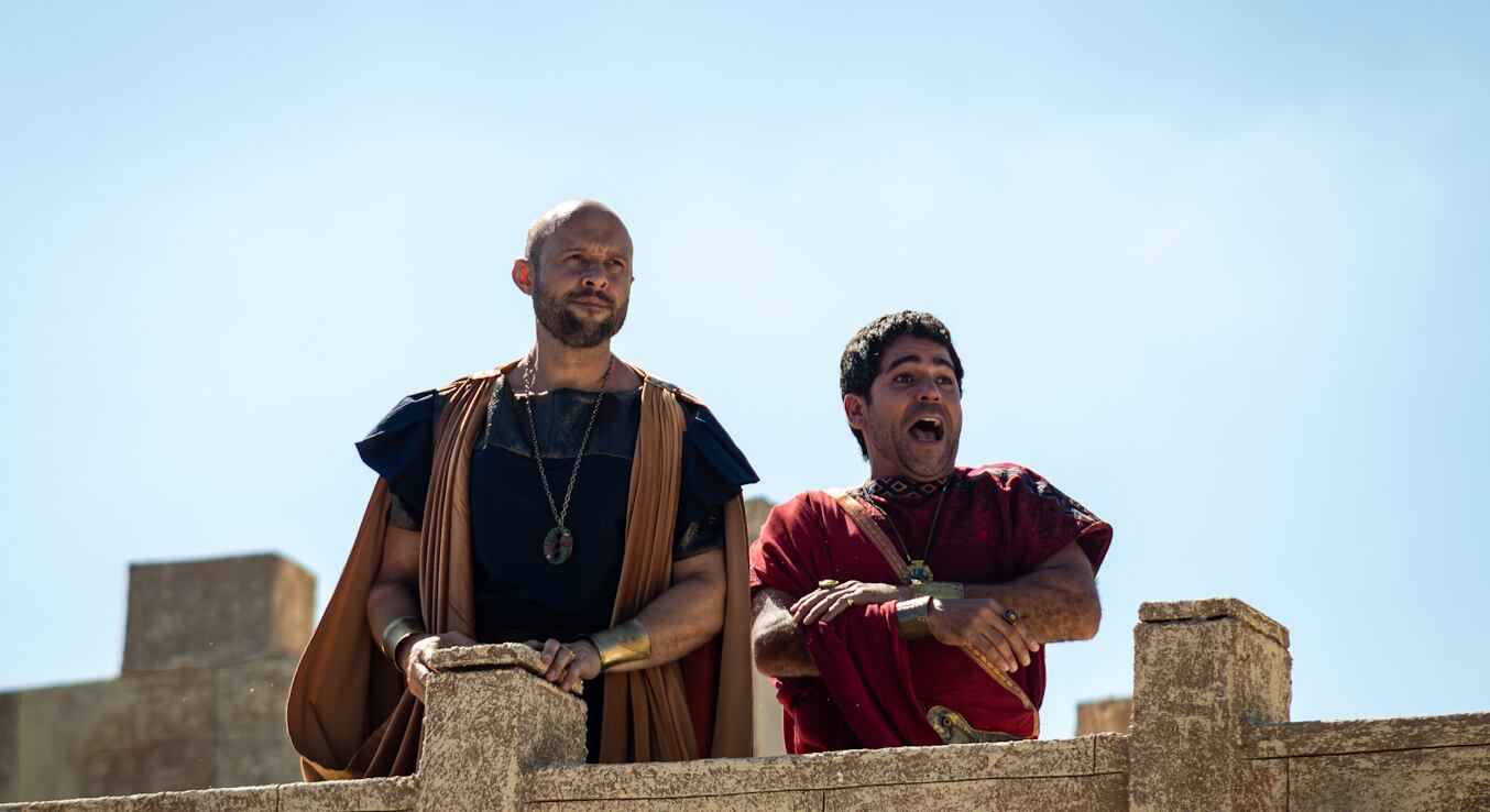 Em uma de suas cenas iniciais, o romano acompanha a confusão entre os soldados e os judeus. Nas redes sociais, o ator compartilhou com os seguidores os bastidores da sequência.