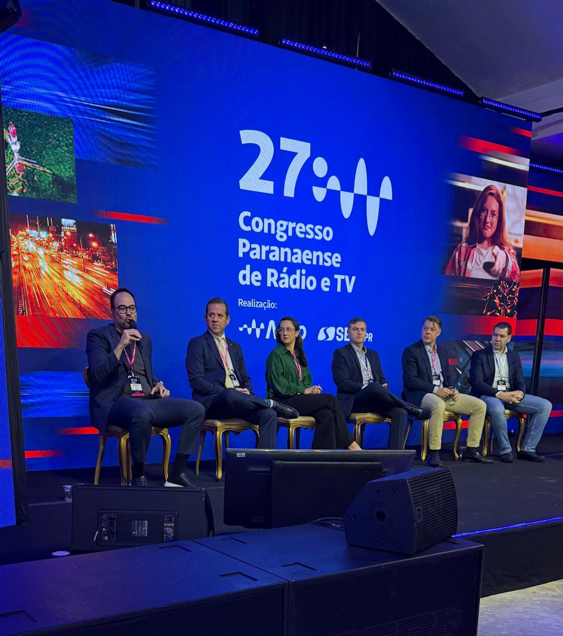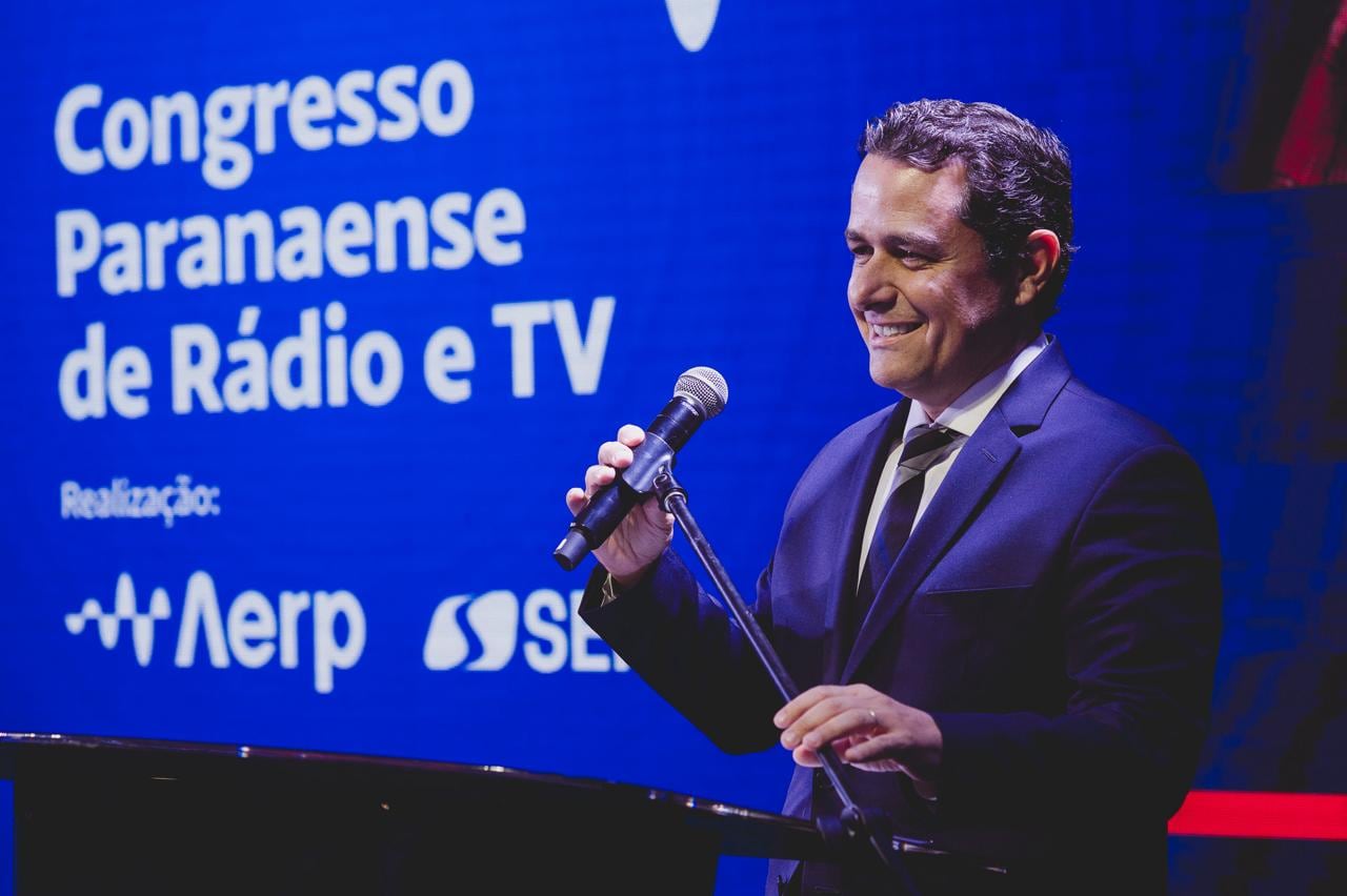 O governador Carlos Massa Ratinho Junior, em missão internacional na Europa, enviou uma mensagem gravada aos participantes, ressaltando a importância da geração de empregos no setor de rádio e TV.