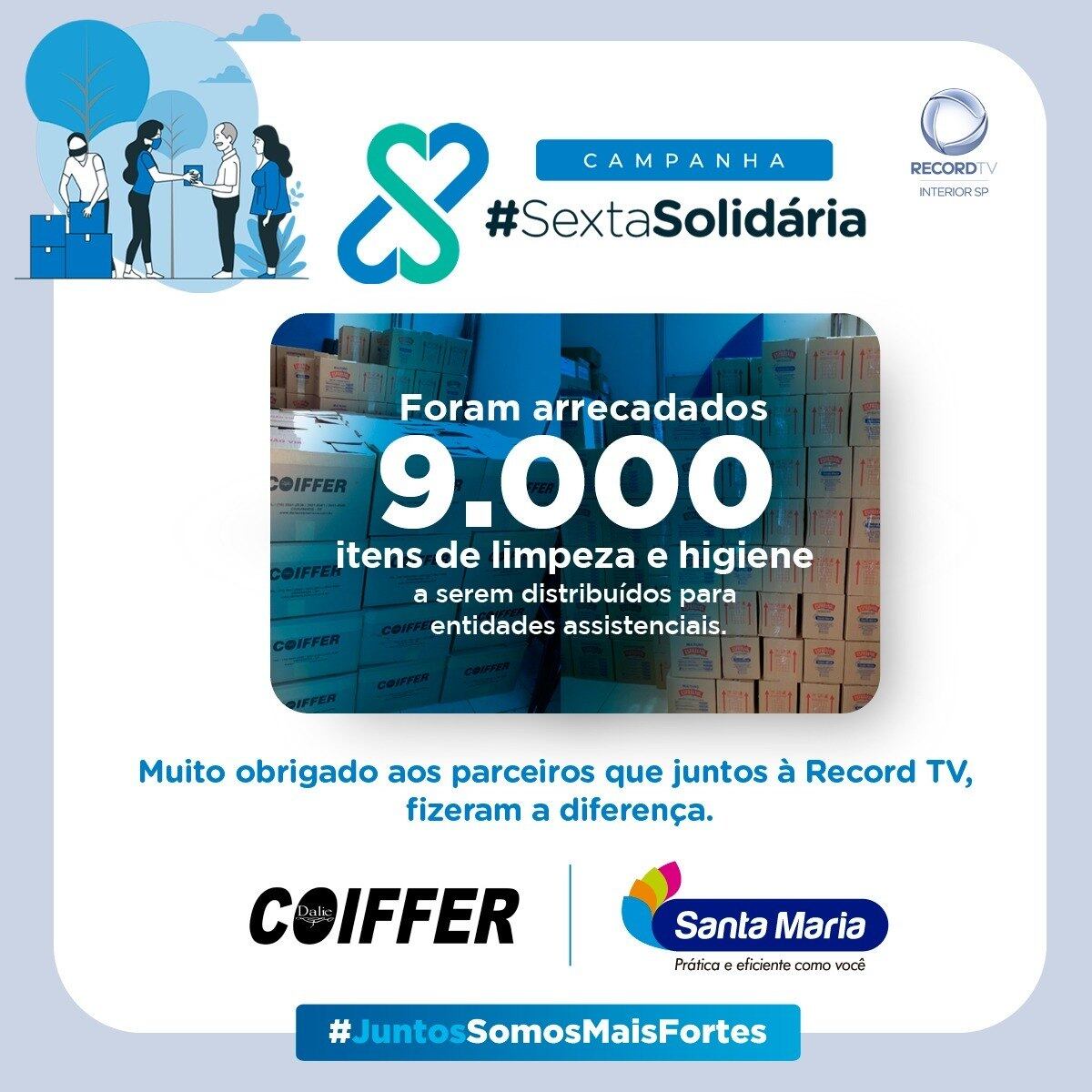 A campanha Sexta Solidária, promovida pela Record TV Interior SP, arrecadou, em parceria com empresas locais, 9.000 produtos de higiene e limpeza, a serem distribuídos em entidades carentes das cidades de Franca e Ribeirão Preto.