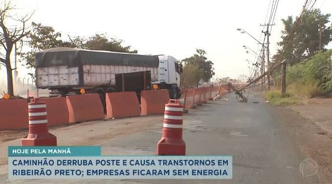 Um caminhão derrubou um poste e causou transtornos hoje pela manhã, na zona norte de Ribeirão Preto. A avenida Thomas Alberto Whately ficou bloqueada e as empresas vizinhas sem energia. Só prejuízo.